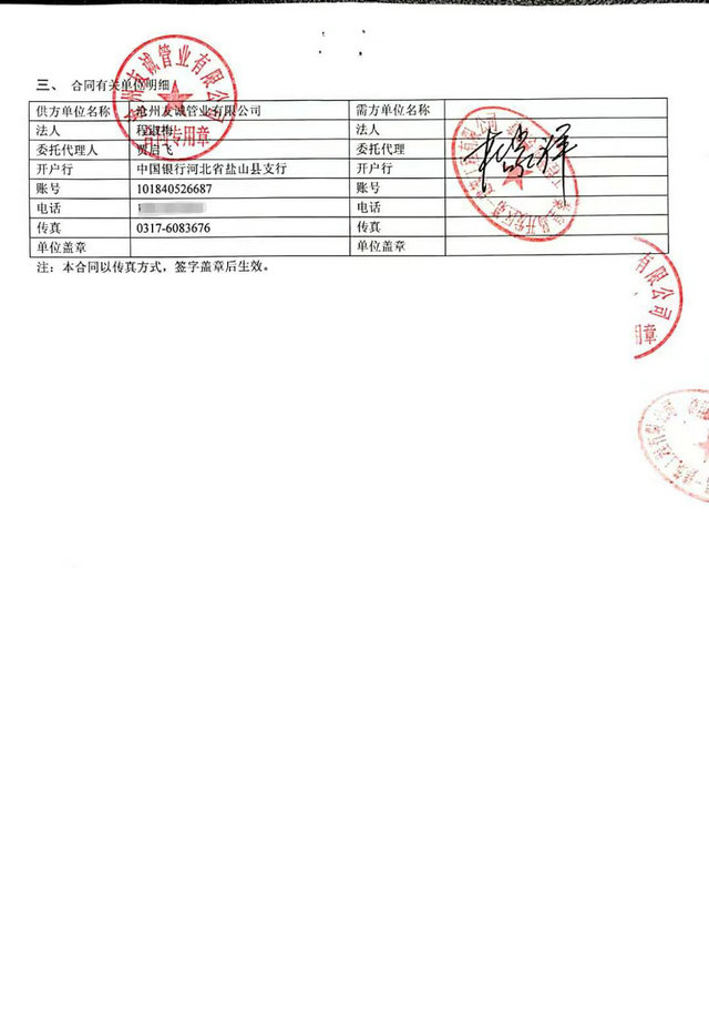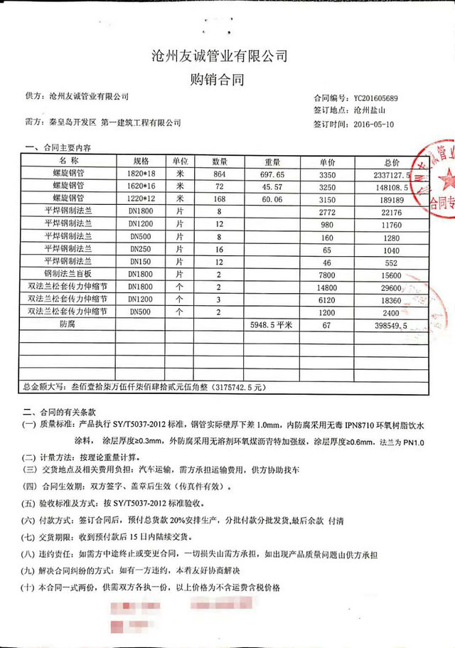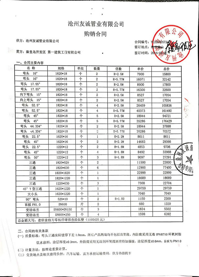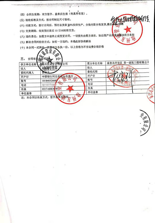 秦皇島開發(fā)區(qū)第一建筑工程有限公司與我公司,2016年簽訂秦皇島開發(fā)區(qū)引青供水工程項(xiàng)目防腐管道合同,我們已最優(yōu)質(zhì)的產(chǎn)品質(zhì)量,順利愉快的完成了這次合作,感謝客戶對我們的信賴,我公司將一如既往再創(chuàng)輝煌